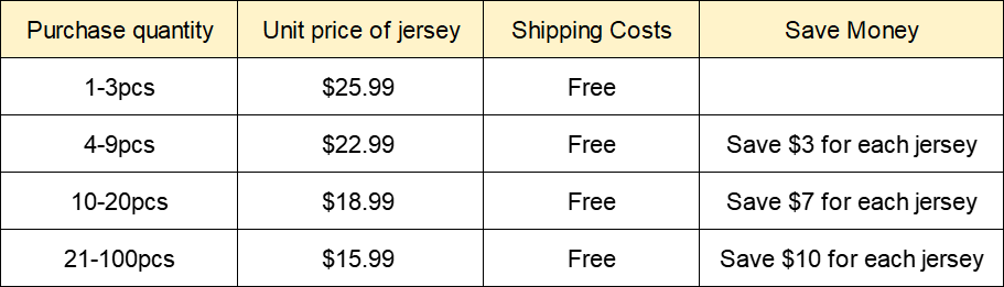By shopping with us, you can save significant costs while getting quality merchandise that meets your needs. We will give away free jerseys and apply for larger discounts based on your order status.